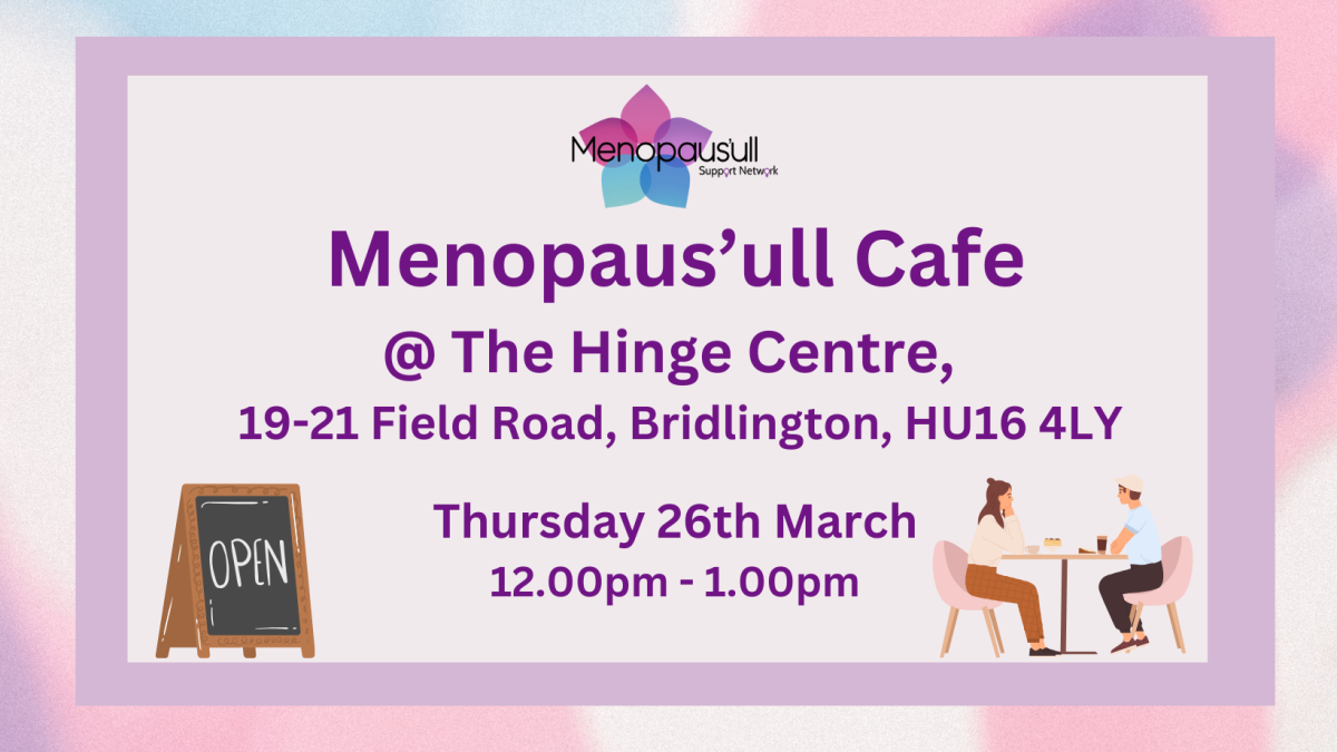 Join us on Thursday 26th March from 12.00pm till 1.00pm for our Menopaus’ull Café at the Hinge Centre, Crown Community Building, 19-21 Field Road, Bridlington, YO16 4LY for an informal chat where we can openly and safely share experiences with other like-minded ladies who are discovering their own ways of coping with this journey, let’s empower each other along the way!