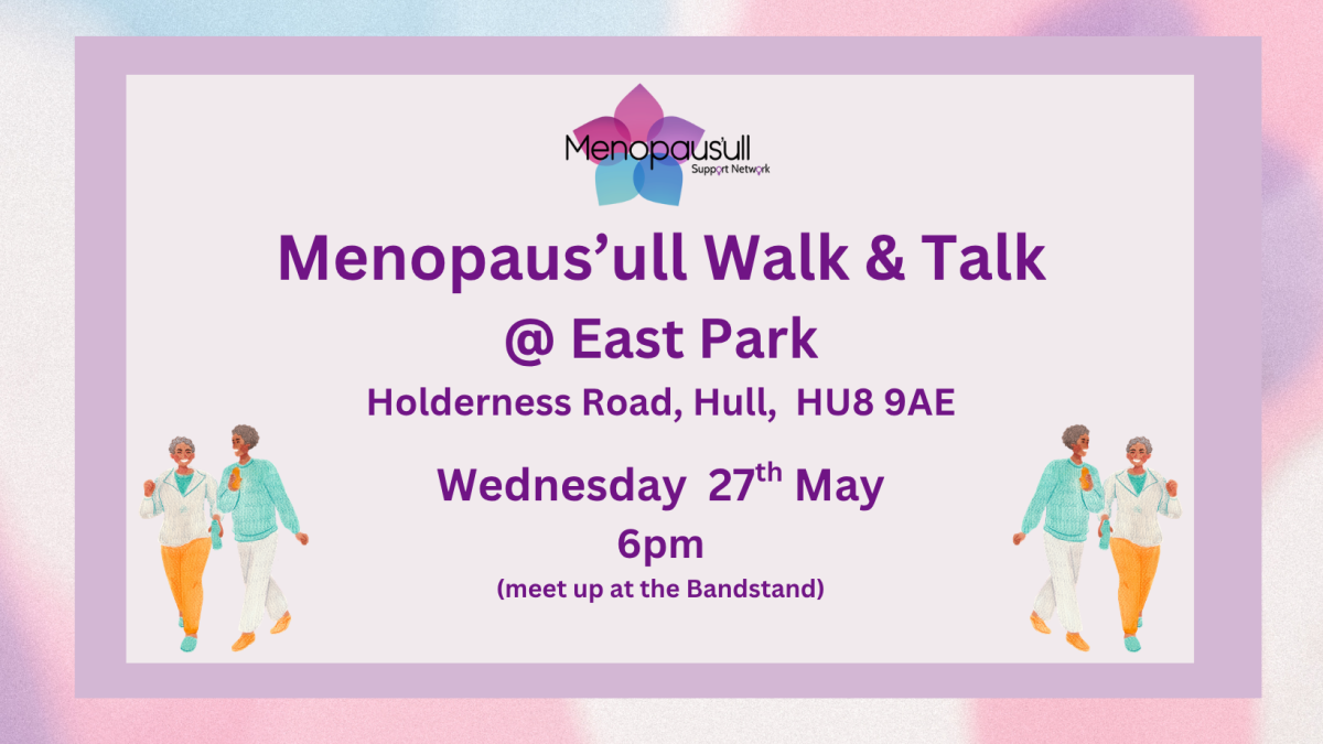 Are you looking for a friendly place to connect, share and move your body? Come along to our Menopaus’ull Walk & Talk in East Park, Hull, HU8 9AE on Wednesday 27th May at 6pm. The meeting point will be at the Bandstand (outside of the cafe area) and the walk will then take place around the park at a leisurely pace.