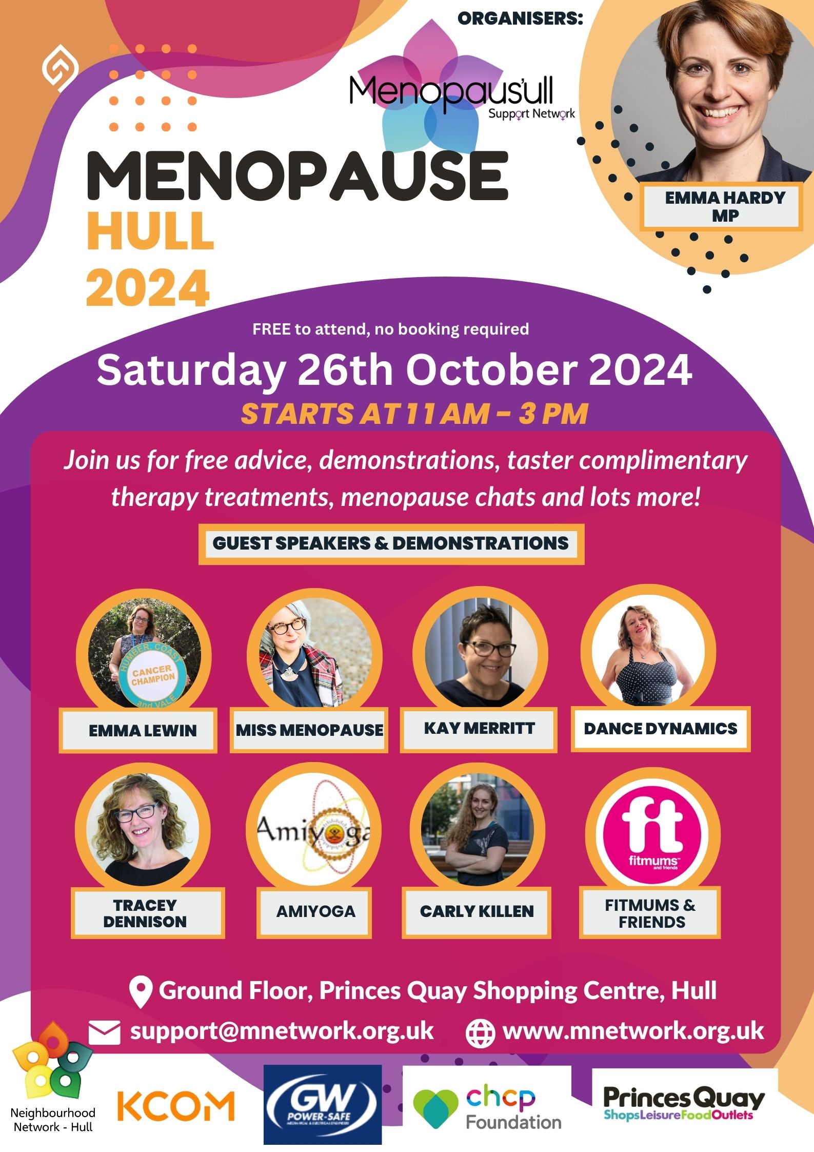 The event will feature a series of informative talks from healthcare professionals, including Kay Merritt from Hull’s Menopause clinic and Sharon MacArthur AKA Miss Menopause! www.missmenopause.co.uk
